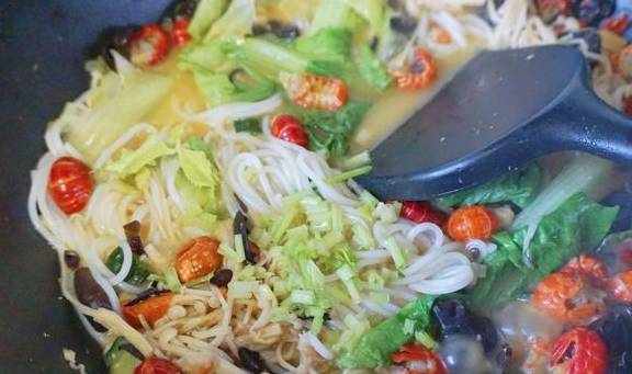 粉條是媽媽在江門給我帶回來的,她說鄰居每次有煮粉吃的時候總給他們送去一碗,媽媽覺得也是很好吃,於是鄰居就送瞭一些柳州帶來的米粉條給媽媽。每次媽媽有好東西都會給我留著,有回來的時候就給我帶回來。用小龍蝦做成的米粉味道嗦起來也不亞於螺獅粉哦,湯汁香濃鮮美,酸香可口,愛嗦粉的朋友們可以試試這個口味的,特別是不愛嗦螺獅粉而又喜歡嗦粉的人就更不要錯過瞭!