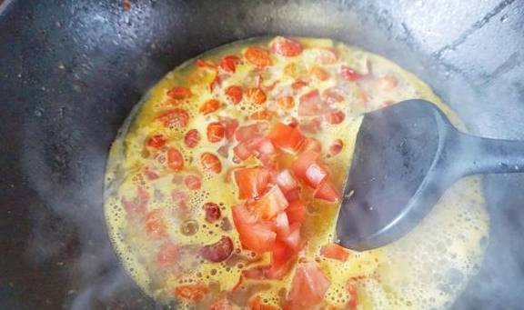 7、湯水沸騰後加入切成小丁的番茄翻拌均勻