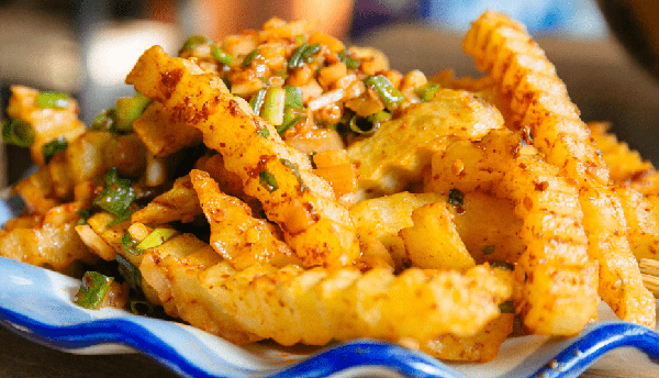 接著就是在盤中加入蔥花、折耳根、香菜、花椒油、油辣椒孜然粉、食鹽、生抽等,然後攪拌均勻,這樣一盤香酥可口、麻辣鮮香的下酒菜炸洋芋就做好瞭。