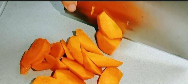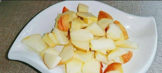 蘋果放鍋裡煮一煮它的營養價值會更高。接著再準備半根去皮的胡蘿卜,把胡蘿卜切成滾刀的小塊兒,
