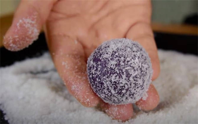 6.這是在網上買瞭一些椰子粉,把它裹在外面,這樣口感更好,像這樣這個糯米糍就做好瞭。
