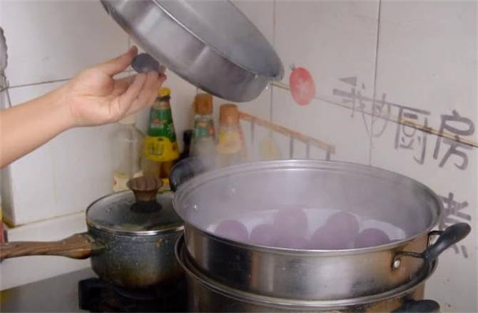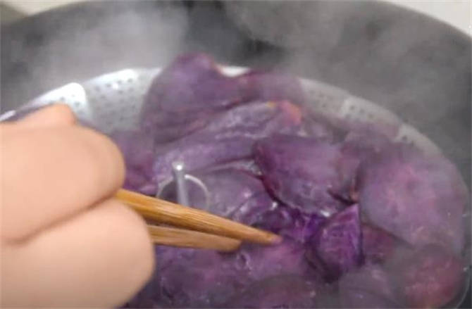 1.紫薯洗凈去皮,咱們把它切成薄片,準備一個蒸屜,上鍋蒸上15分鐘,現在紫薯已經蒸好瞭,筷子插上去軟軟糯糯的,出鍋瞭。