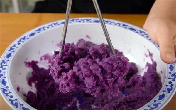 2.趁熱加一些白糖進去,愛吃甜的就多放一點,搗成像這樣的紫薯泥就行瞭。