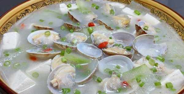 1、花甲處理幹凈,冬瓜去皮,切成薄片,一塊豆腐切成厚片,瘦肉切成薄片,準備點薑片,蔥花備用。