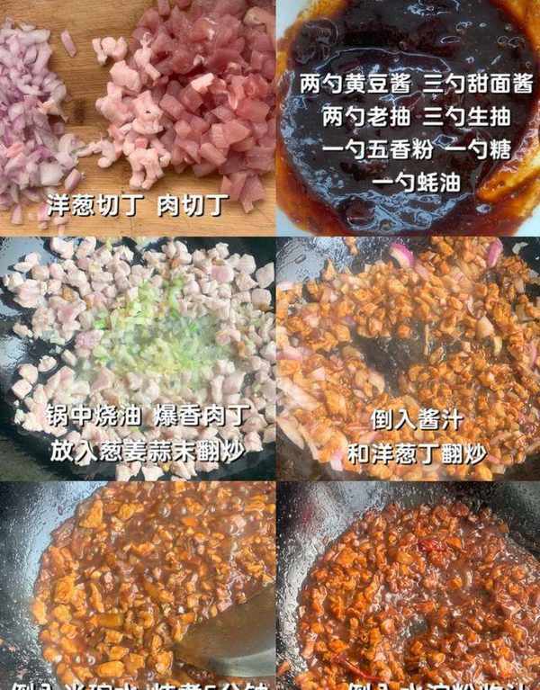 5.炒醬:鍋熱後加油,放入肉末爆炒至變色,依次加入蔥薑蒜末、豆瓣醬、郫縣豆瓣醬,攪拌均勻。