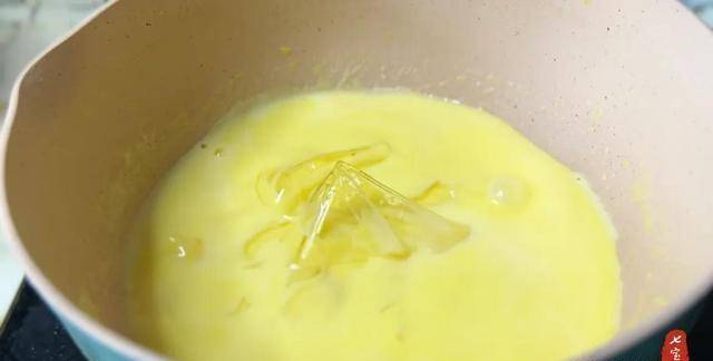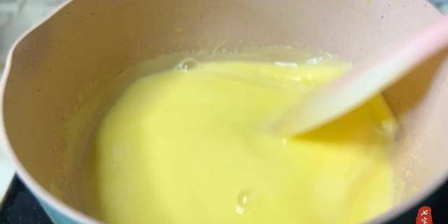8、將牛奶蛋黃液用小火慢慢熬煮,刮刀不停地攪拌,煮到稍微粘稠,溫度大概在80度的時候就可以關火瞭。