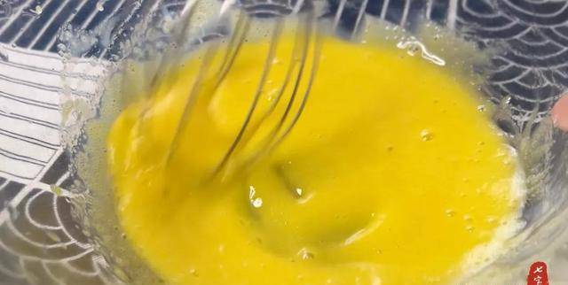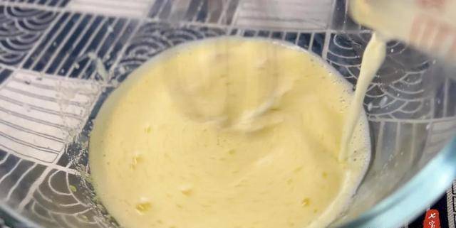 7、一邊攪拌蛋黃一邊倒入牛奶,混合均勻。