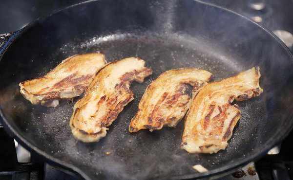 等到五花肉醃制夠時間後,撈出瀝幹水分,就可以開始煎瞭。煎之前,一定要讓煎鍋充分預熱,加入適量油,等油熱瞭以後再放入五花肉。等一面煎至金黃色,再翻面繼續煎,直到兩面都變得酥脆。(註:一點要用小火慢煎才會酥脆)