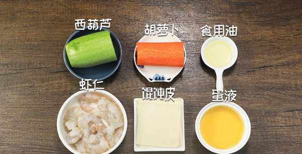 準備食材:蛋液:1個,食用油:1克,蝦仁:100克,胡蘿卜:60克,西葫蘆:60克,餛飩皮:10張