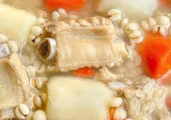 3、將排骨、薏米、胡蘿卜、薑片放入湯鍋中,再加入足量的清水,蓋上蓋子燉煮40分鐘。接著再放入山藥和胡蘿卜繼續燉煮半個小時。