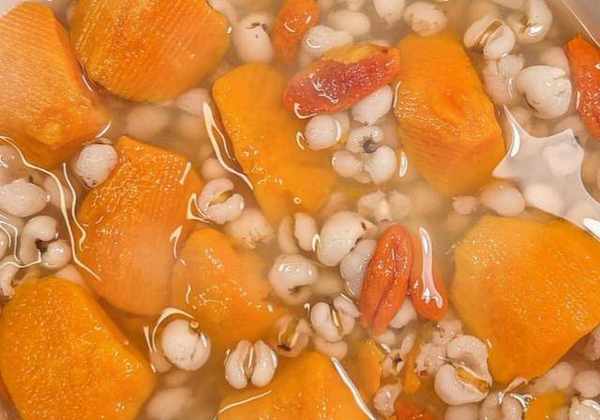 2、起鍋燒水,將薏米放進去煮一個小時左右,煮至薏米膨脹煮軟瞭,就可以放入紅薯和冰糖,繼續煮半個小時。
