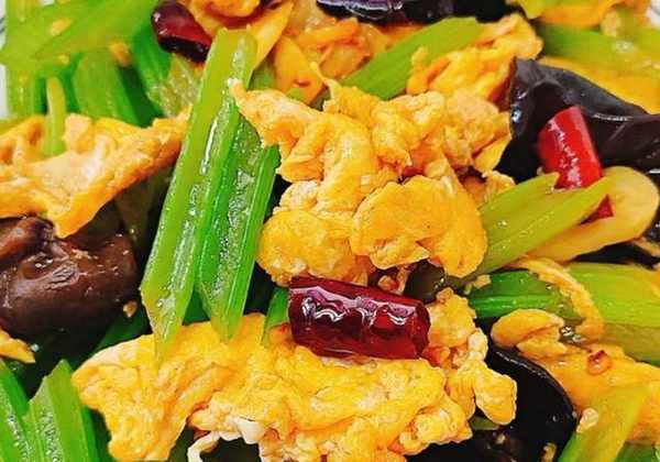 1、芹菜摘掉葉子,清洗幹凈切成小段。黑木耳泡發洗凈即可,蒜切成蒜片,幹辣椒切成小段。雞蛋打入碗中攪散備用。