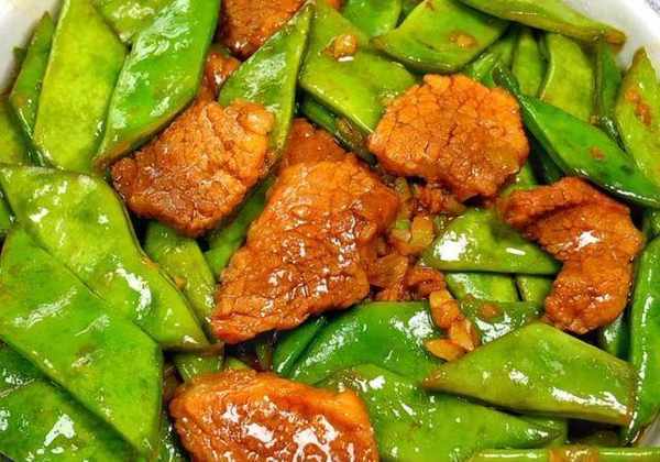 3、起鍋燒油,油熱後放入蒜末爆香,再放入醃制好的瘦肉翻炒一會兒,炒熟肉片後放入扁豆翻炒均勻。