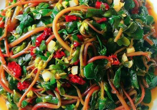1、馬齒筧放入清水中,加入一勺食鹽攪勻浸泡十分鐘,然後再清洗幾遍清洗幹凈。鍋中水燒開,放入食鹽和食用油,再放入馬齒筧焯水煮熟,然後撈起來過一遍涼水,擠幹水分後裝入盤中備用。
