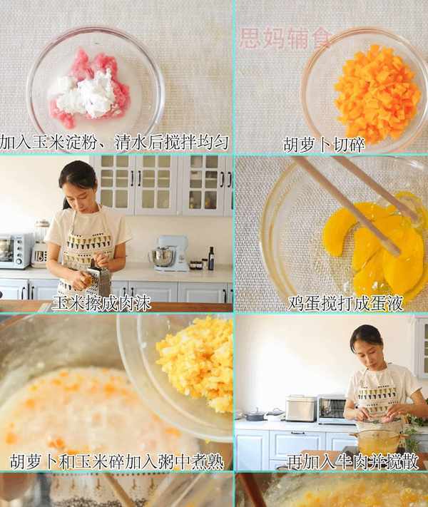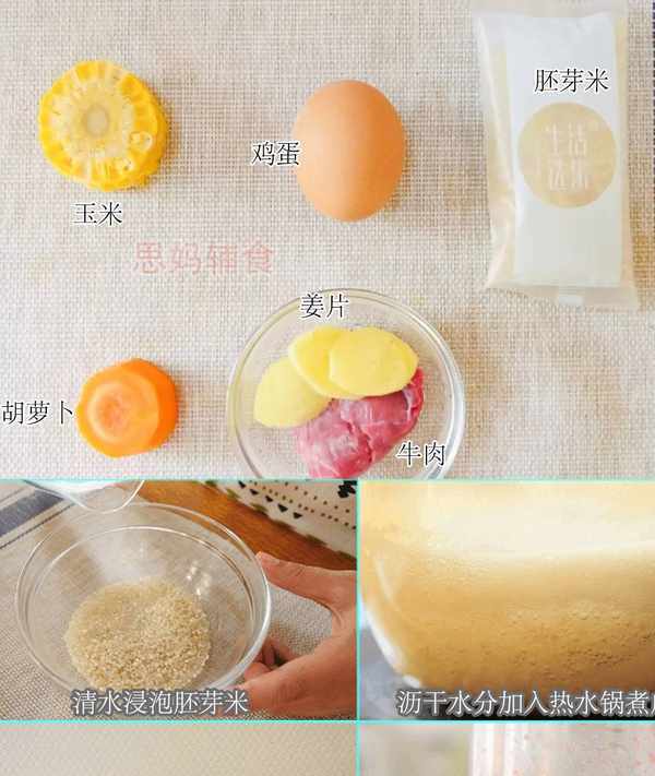 ?食材準備:牛肉40克、胡蘿卜20克、胚芽粥米25克、玉米50克、雞蛋1個