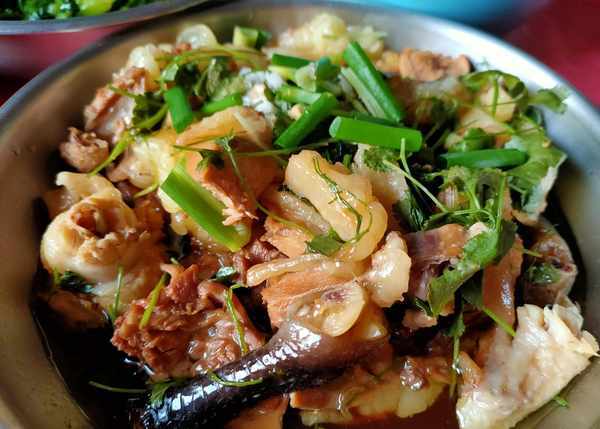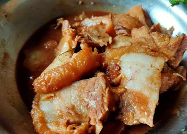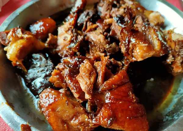 第一眼看到這道菜,我以為是燒鴨,因為那鴨皮真的是太像燒鴨瞭。但是準大嫂說是這是酸梅燜鴨。還沒嘗這道菜之前,我猜味道很不錯,這顏色簡直太過於紅亮瞭,看著就應該很好吃的。但是吃瞭一口之後,發現簡直要甜到膩,嘗過後有才發現,原來那鴨皮這麼紅,是放瞭好多白糖炒糖色,整隻鴨都給上色瞭,所以才這麼漂亮。看著顏色很不錯,但是也不知道大嫂是頭一次做還是失手多放瞭白糖,甜肉真的好難吃,這簡直就是糊弄的菜式。