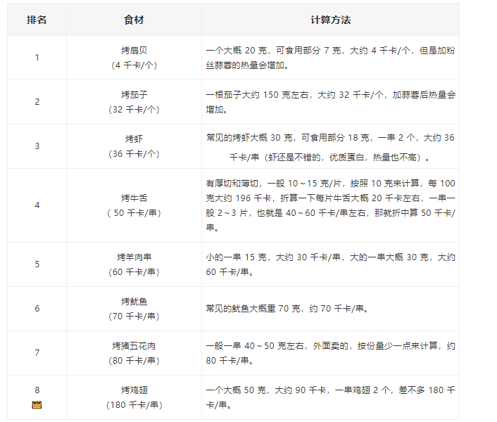 其實燒烤最受關註的就是熱量問題,下面給大傢大概介紹一下常見食材的熱量,這樣可以有一個預估。想要減肥的親們,算一下吃一頓燒烤的熱量需要跳多久的操才能消耗下去,是不是瞬間冷靜瞭。