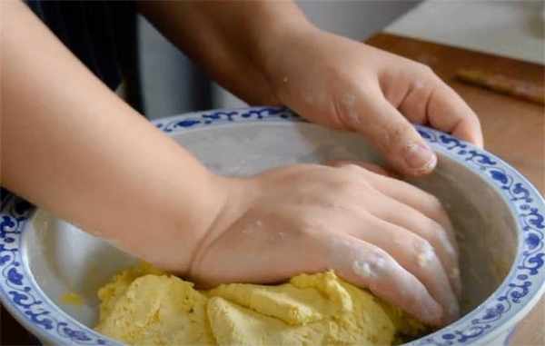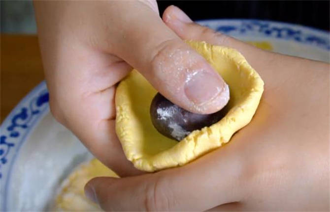 3.直接下手瞭,揪取適量大小面團,在掌心團圓瞭,然後按扁,按成一個小窩窩的形狀,準備一個豆沙餡包在裡面,然後用虎口處把它收緊,收緊後在掌心再次團圓。