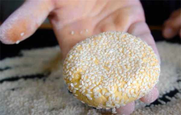 4.做好之後滾上一圈白芝麻,滾好之後直接按扁,這個餅胚就做好瞭。