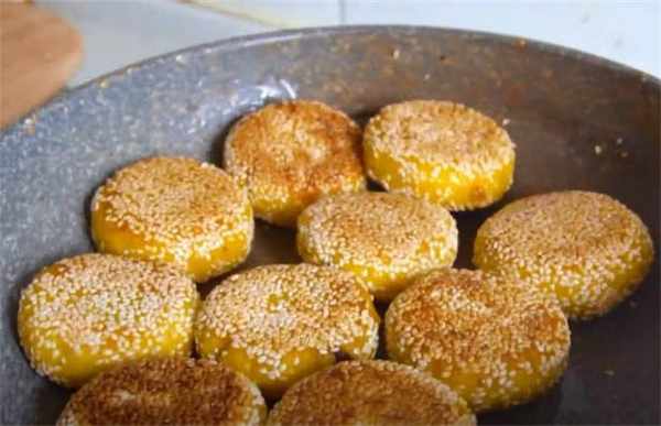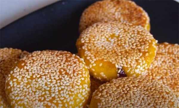 6.看看這個顏色多漂亮,剛做好的這個南瓜糕特別的軟,而且裡面還放瞭夾心餡,看著就非常好吃,糯米粉真是太適合做這種小甜點瞭,外面的一層芝麻特別的香,喜歡這種糕點的趕緊試試吧。