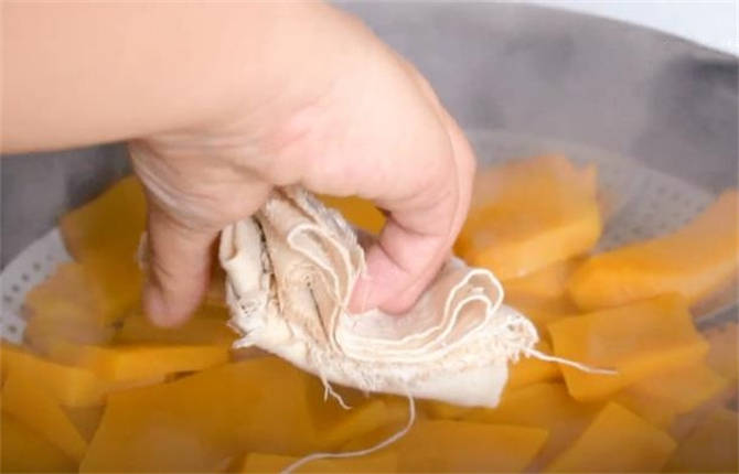 1.準備一塊南瓜,把南瓜皮給削瞭,再切成小塊,把南瓜蒸一下,大火燒開蒸15分鐘,現在已經蒸好瞭,把南瓜蒸軟瞭就行瞭,取出來。