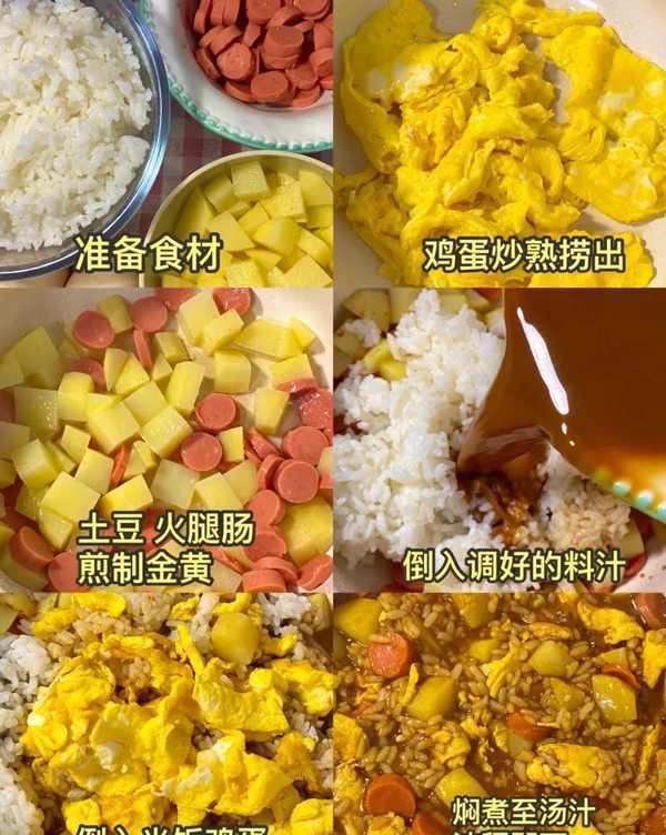 做法:雞蛋炒熟撈出;土豆 火腿煎制金黃色;倒入調好的醬汁:一勺生抽半勺老抽一勺蠔油一勺番茄醬一勺淀粉一點點鹽加入水攪拌均勻;倒入雞蛋米飯燜煮醬汁濃鬱即可