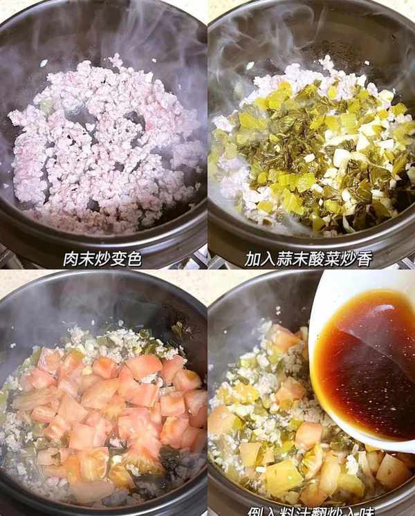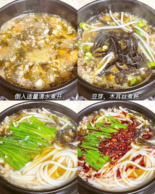 做法:先調個料汁,一勺料酒+兩勺生抽+適量鹽+一勺糖+少許胡椒粉+少許雞精+小半碗水拌勻;鍋中倒少許油,將肉沫炒至變色,下酸菜蒜末炒香後放番茄丁炒出汁。倒入料汁翻炒入味後加入適量清水煮開;先加木耳豆芽等配菜煮一會,然後加入米粉,擺上韭菜,全部煮熟後淋上辣椒油就搞定啦。