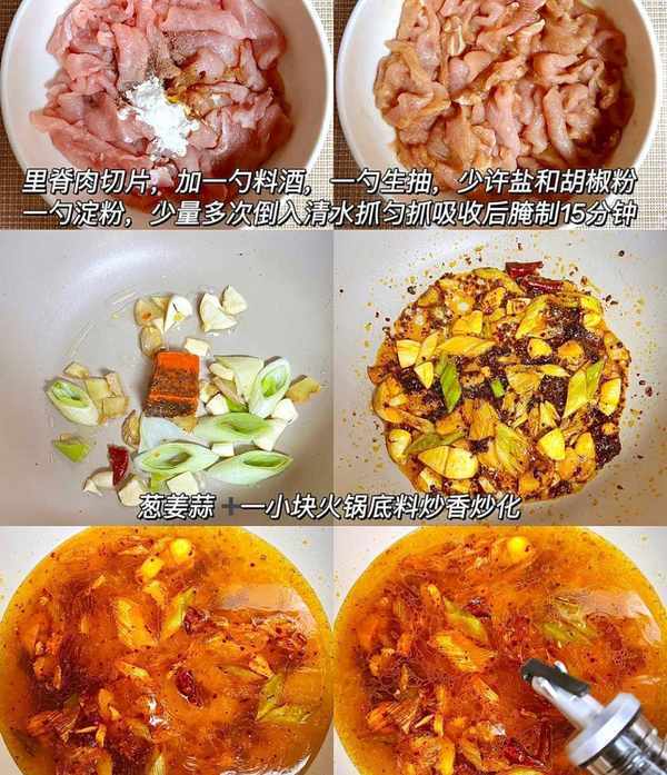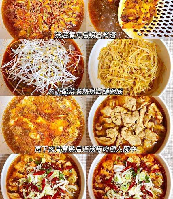 做法:醃制肉片,裡脊肉切片,加一勺料酒,一勺生抽,少許鹽和胡椒粉,一勺淀粉,再少量多次倒入清水(用蔥薑水更好哈),抓勻抓吸收後醃制15分鐘;湯底的制作:蔥薑蒜,火鍋底料炒香炒化,倒入適量清水(有開水更好),加兩勺生抽,一勺蠔油,適量鹽,糖,雞精調味,煮開後撈出料渣,湯底搞定;先下配菜煮熟撈出鋪碗底,再下肉片煮熟後連湯帶肉倒入碗中,加蔥蒜末,幹辣椒花椒,辣椒面白芝麻,淋上熱油搞定(不能吃辣的寶子這一步也可以不放辣椒哈)。
