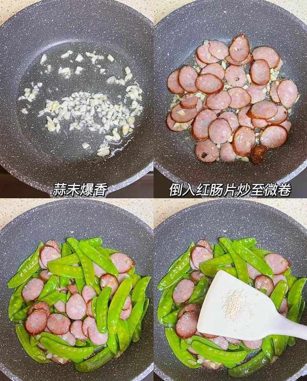 做法:紅腸切片,荷蘭豆掐頭尾洗凈瀝幹,蒜瓣切末備用;鍋中加油爆香蒜末,倒入紅腸片炒至微卷,再放入荷蘭豆炒至全部變色,然後加適量鹽,糖,雞精調味即可。