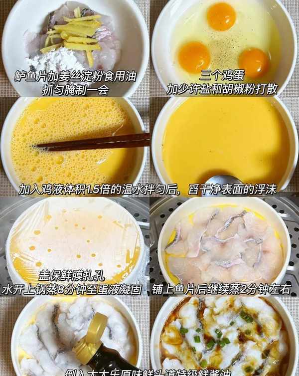 做法:鱸魚切片(也可以直接買成品的鱸魚片),加薑絲,淀粉,食用油抓勻醃制備用;三個雞蛋加少許鹽和胡椒粉打散,兌入蛋液體積1.5倍的溫水拌勻後舀幹凈表面的浮沫;蓋保鮮膜紮孔,水開上鍋蒸8分鐘至雞蛋表面凝固,鋪上鱸魚片再蒸2-3分鐘左右,至鱸魚全部變色就可以出鍋啦;倒入醬油,灑上蔥花,淋上熱油就可以享受美味啦~
