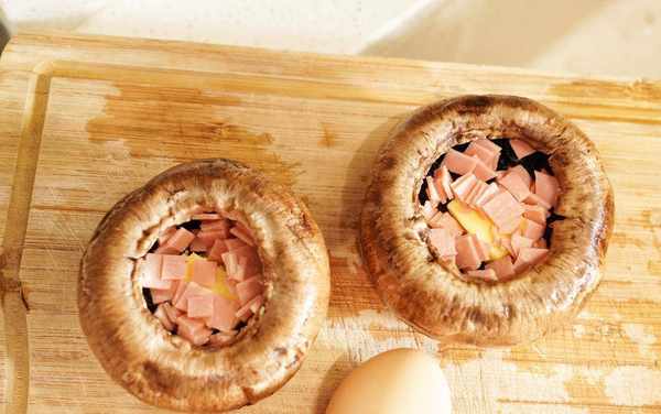 5、在每個牛排菇裡放入切碎的培根