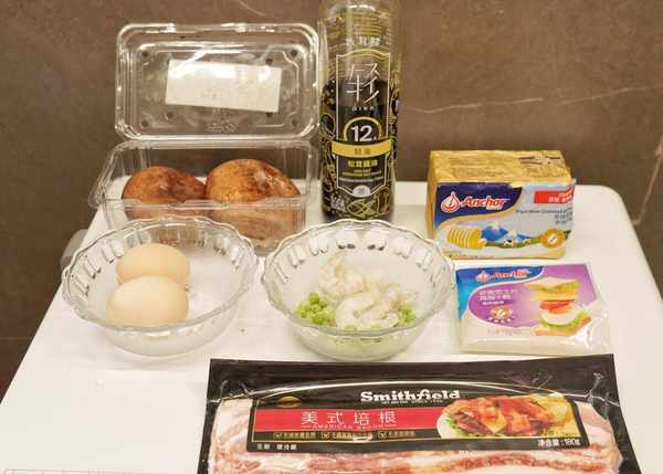【蝦仁培根蛋豆烤芝香牛排菇】蝦仁2隻,豌豆12粒,培根1片,初生蛋2個,牛排菇2個,芝士片1片,黃油10克,黑椒碎2克,松茸醬油5毫升