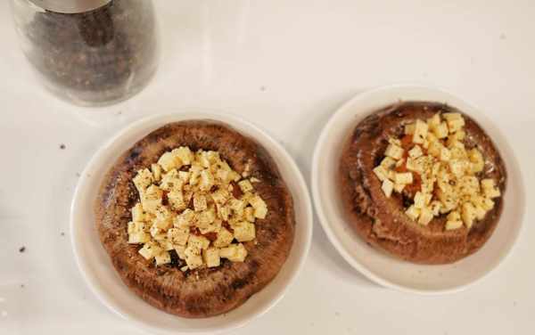 10、在每個牛排菇裡放入切成小方粒的芝士