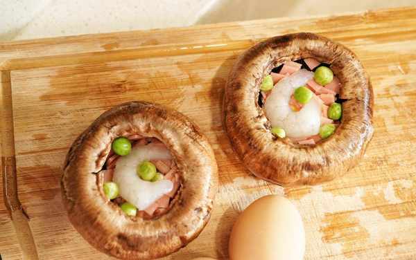 6、在每個牛排菇裡放入去蝦線洗凈的蝦仁