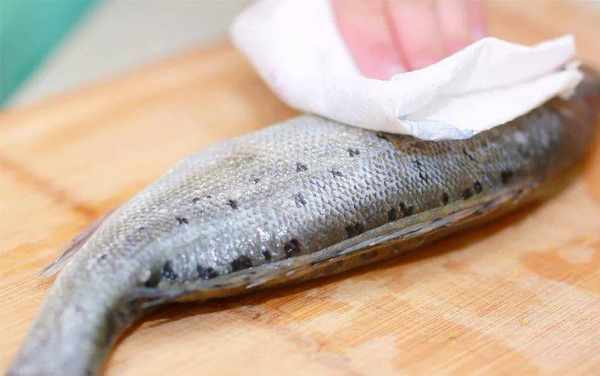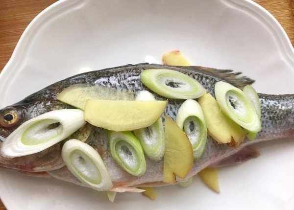 1.準備一條新鮮的鱸魚,可以讓老板幫忙處理好,拿回傢之後仔細的清洗一遍,接著瀝幹水分,放在案板上用刀在刀背上切幾刀,這樣才更方便入味。隨著撒上一點食用鹽,倒上一點料酒醃制一會,大概醃制五分鐘左右,五分鐘之後把多餘的水分倒掉,將魚擺放在盤子裡。