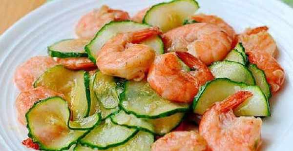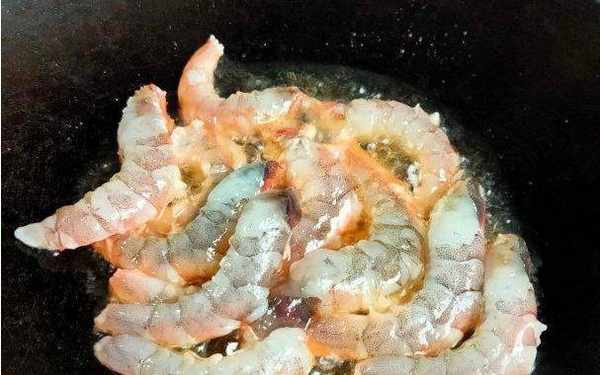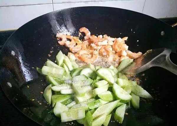 2. 接著起鍋燒水,水開之後把黃瓜和胡蘿卜放下去焯水1分鐘,焯好水之後撈出來備用。接著起鍋燒油,油熱之後放入薑蒜爆香,炒出香味之後下入蝦仁,一直翻炒至蝦仁變色。