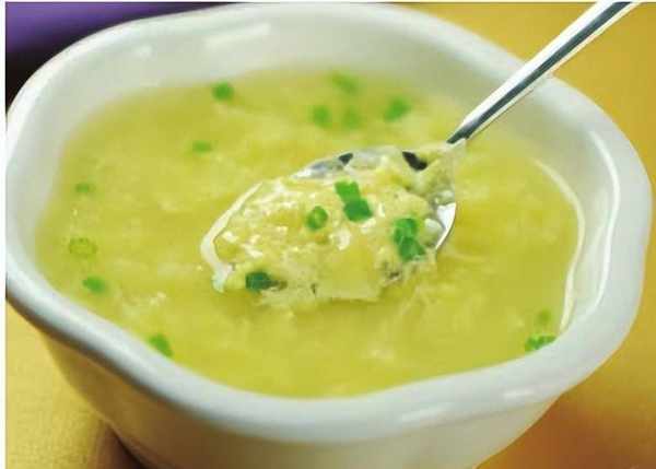 4.用勺攪動湯汁,淋入蛋花,待凝固時,倒入湯碗內即成。