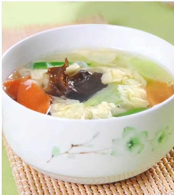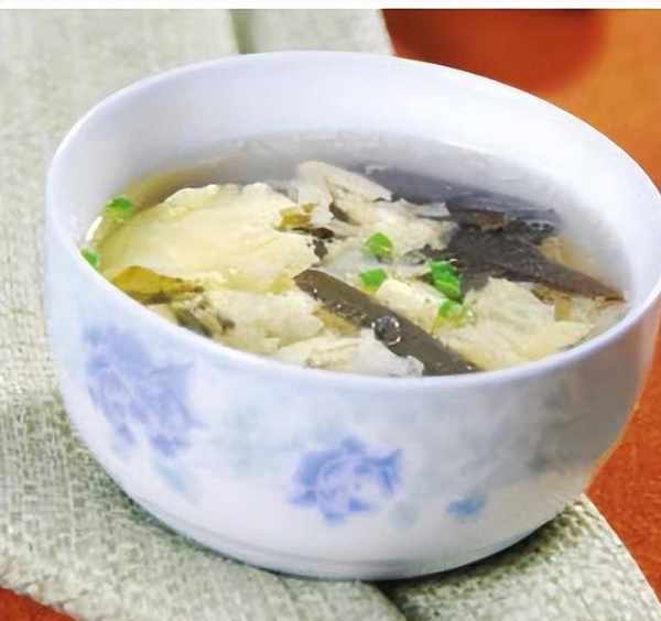 原料:幹紫菜 15 克,黃瓜 100 克,雞蛋 1 個,蔥絲少許。