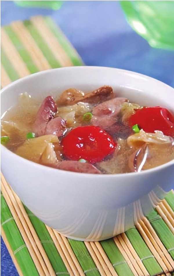 4.待鍋內的湯燒開,撇去浮沫,將冬菜、紅泡椒置入湯內,用小火煮 5 分鐘即可盛入湯碗內。