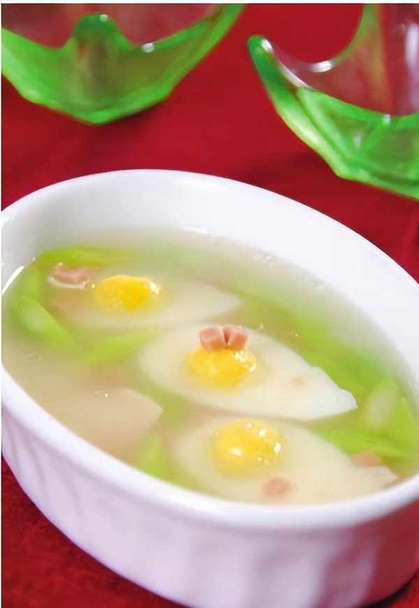 調料:蔥 10 克,鹽 6 克,植物油 9 毫升,淀粉 3 克,味精 1 克,清湯 1000 毫升。