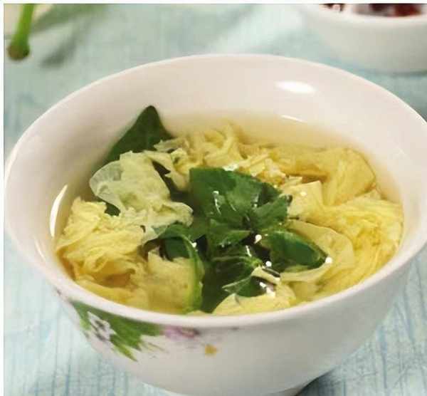 3.炒鍋放植物油燒至六成熱,將蛋液倒入鍋內打散,放入雞湯、薑絲、鹽、味精、料酒、醋和甘菊苗,待湯燒開,撇去浮沫,淋上香油即成。