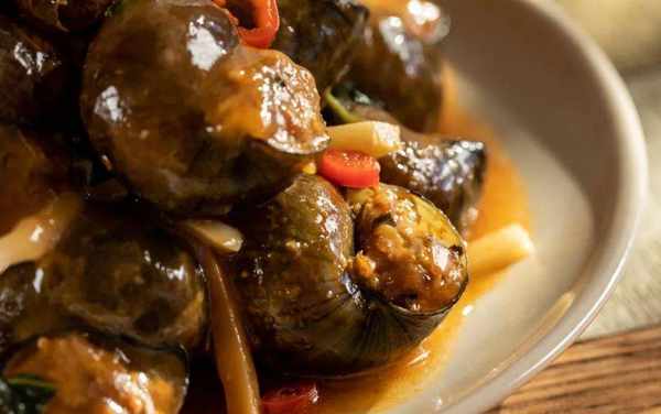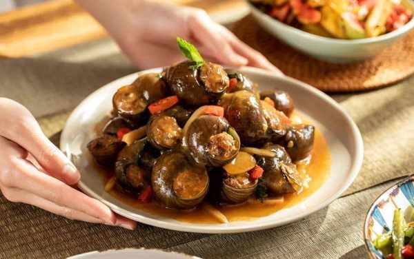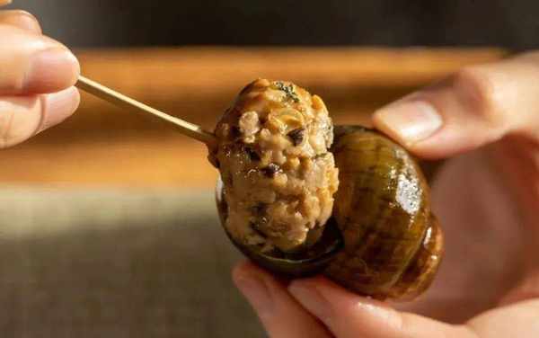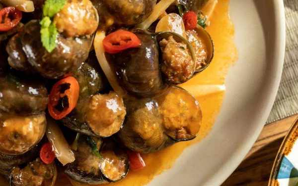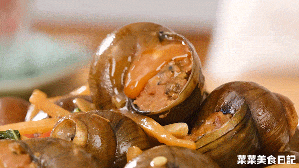 以大螺殼為容器,釀入螺肉、豬肉、菌菇混合成的餡兒,將鮮、香、嫩、滑、甜一網打盡。