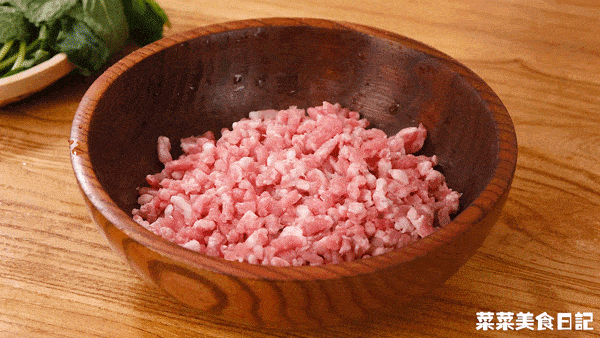 5.豬肉糜中加入1小勺鹽、1/2小勺糖、1小勺蠔油、1大勺生抽、1大勺淀粉順時針攪打上勁