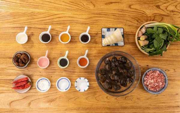 大田螺1kg 豬肉糜(後腿肉)300g 泡發香菇50g 薄荷葉或者紫蘇葉20g 酸筍50g
