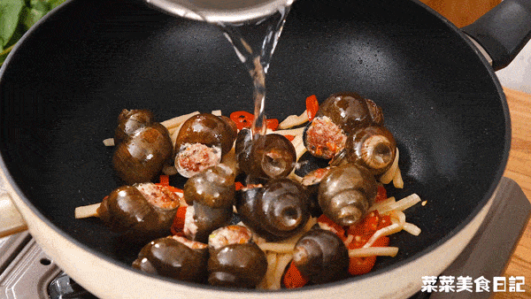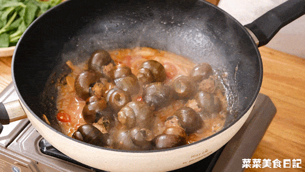 這道菜還講究一個“先炒後燜”,讓田螺釀定型之後,再慢慢滲入其他風味。