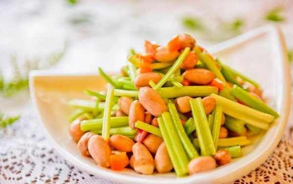 1.準備一把芹菜,記得要選擇嫩一些的,口感比較好,洗幹凈之後切成小段。接著再來一碗花生,用水洗一洗表面的灰塵,洗幹凈之後控水撈出。然後起鍋燒水,煮瞭之後把芹菜和花生放下去,煮上兩分鐘的時間,接著再控水撈出來。
