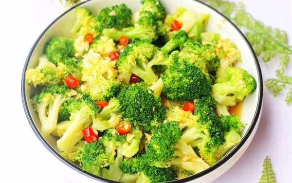 2. 接著起鍋燒水,水開之後將西蘭花和胡蘿卜放進去,焯水一分鐘,一分鐘之後再撈出來。裝入一個盤子中,加入切好的蒜末和小米辣,再倒入適量的生抽、雞精、食用鹽、白醋、香油,將它們攪拌均勻,入味之後就可以使用瞭,這個做法很簡單,熱量也比較低,適合在減脂期吃。