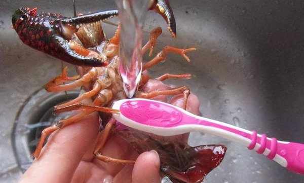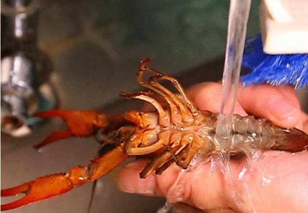 2.兩到三小時後我們再換一盆清水,然後用手抓住小龍蝦的尾部,輕輕扭動兩下。把龍蝦裡面的蝦線取出來。然後再用幹凈的牙刷,把腹部的臟東西清洗幹凈。