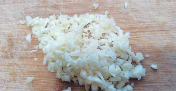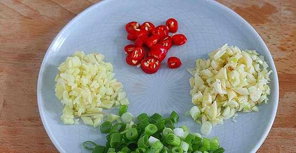 2.大蒜兩頭去掉外皮,然後拍散切碎放入碗中。大蔥一根切成蔥花。