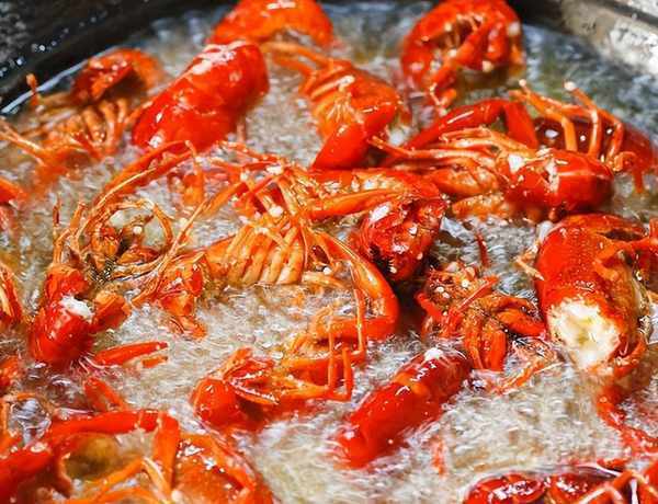 3.炒鍋燒熱放入寬油,油溫燒至五成熱把準備好的小龍蝦放入鍋內。用大火炸制兩分鐘。炸好後撈出。控油備用。